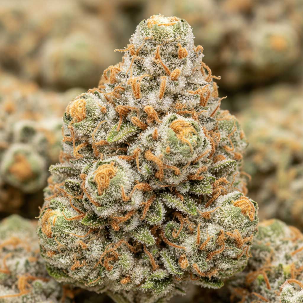 Papaya Frosting plants display a compact, bushy, and vigorous Indica-dominant structure, ideal for indoor cultivation due to its manageable height. The buds are typically dense, elongated, and highly appealing, often displaying lime green, purple, and golden hues. The name “Frosting” refers to the exceptional density of golden-white trichomes covering the flowers, making it a heavy resin producer suitable for high-quality extracts. The short flowering time of 8–9 weeks allows for efficient crop cycles.